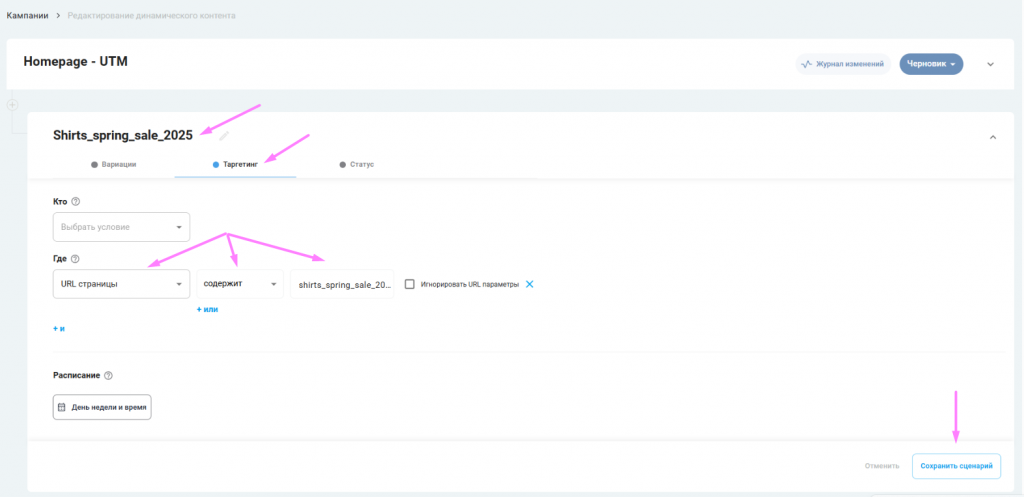 - выбираем условие, при котором будет отображаться подменный баннер — URL (веб-адрес страницы) содержит “shirts_spring_sale_2025”;