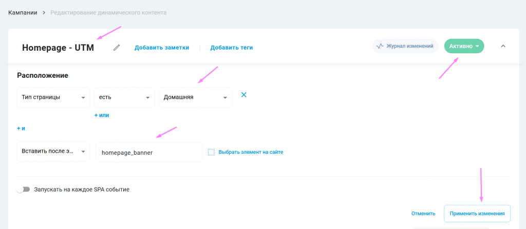 - Визуальный редактор правил: Позволяет настраивать сценарии показа контента в зависимости от UTM (метки отслеживания источников трафика) без кода;
