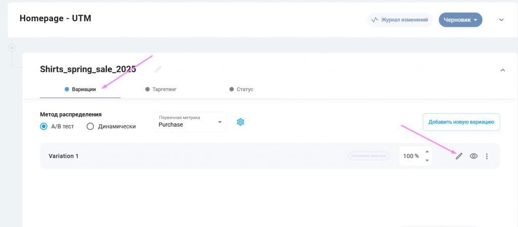 3. Переходим во вкладку «Вариации»: