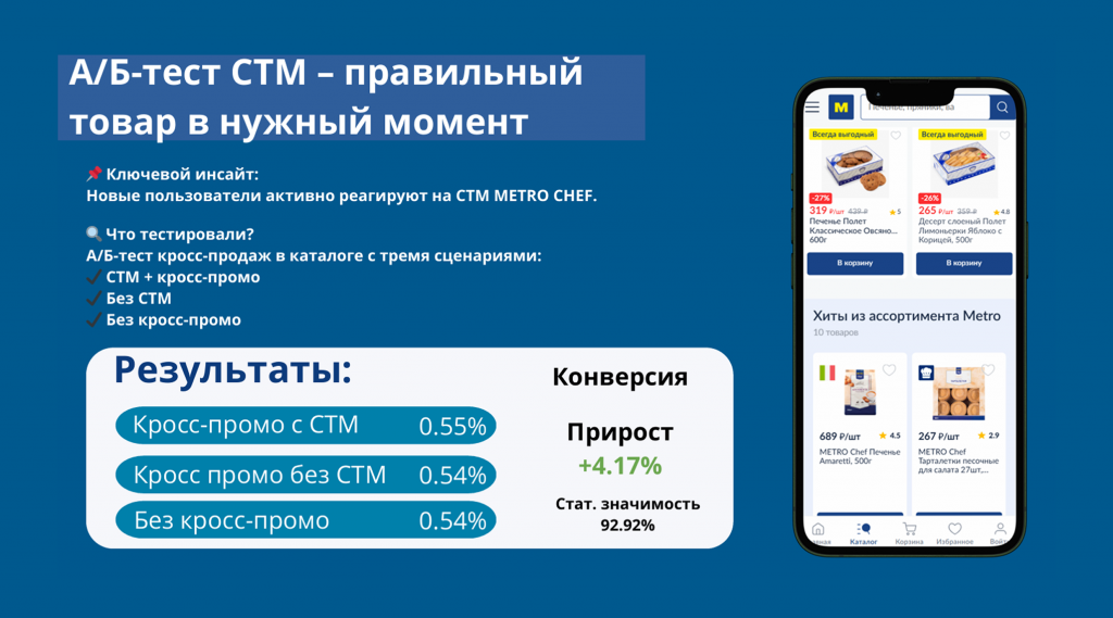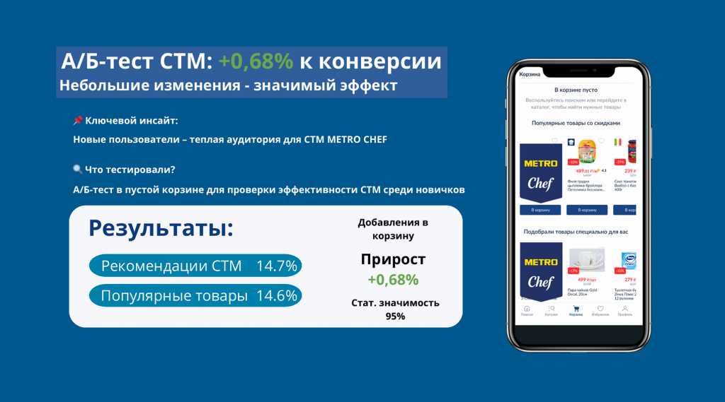 Рост в 0.68% может показаться небольшим, но для крупного ритейлера это тысячи дополнительных заказов в месяц. Даже небольшие изменения в логике показов дают значимый эффект при масштабировании. Главное — опираться на данные, а не на интуицию.